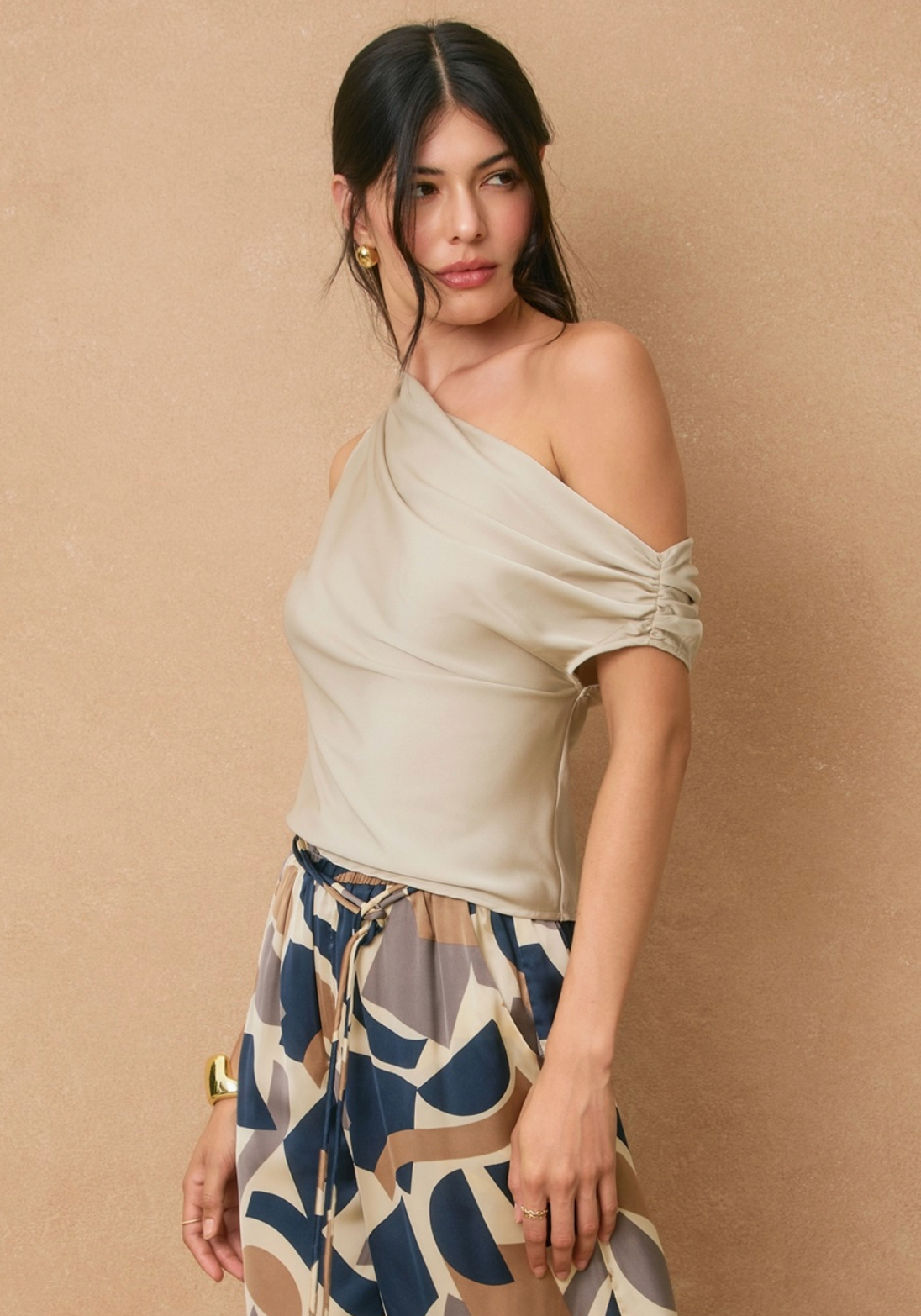 Elevate your wardrobe with The Bea top! This stunning top features an asymmetrical shoulder design and is made from luxurious dull satin. Its sleek silhouette is perfect for any occasion, providing both style and comfort. Add a touch of elegance to your look and stand out with The Bea top!