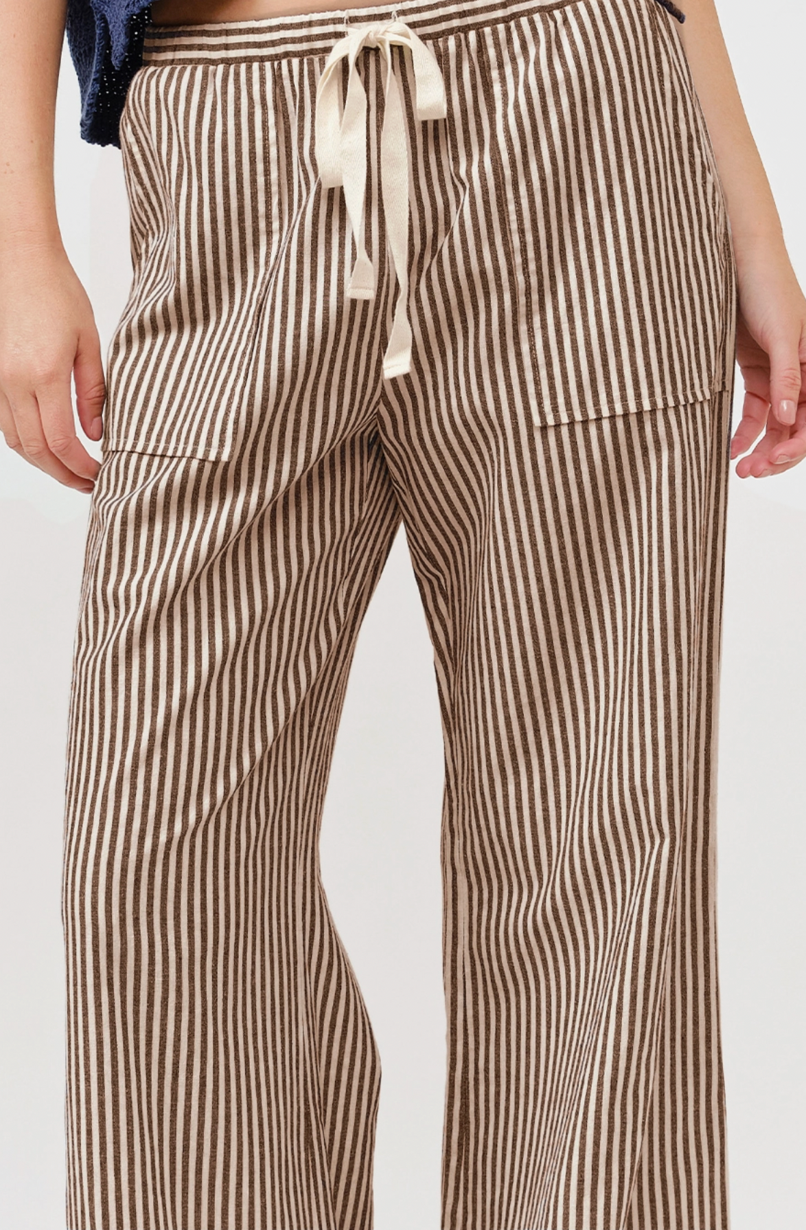 The Chichi pants blend refined style with effortless comfort, featuring a chic striped print and a modern wide-leg silhouette. Designed with a contrast drawstring tie and an elastic waistband, they offer a tailored fit with ease. Practical patch pockets add subtle functionality, making these pants a versatile choice for both polished and relaxed occasions.