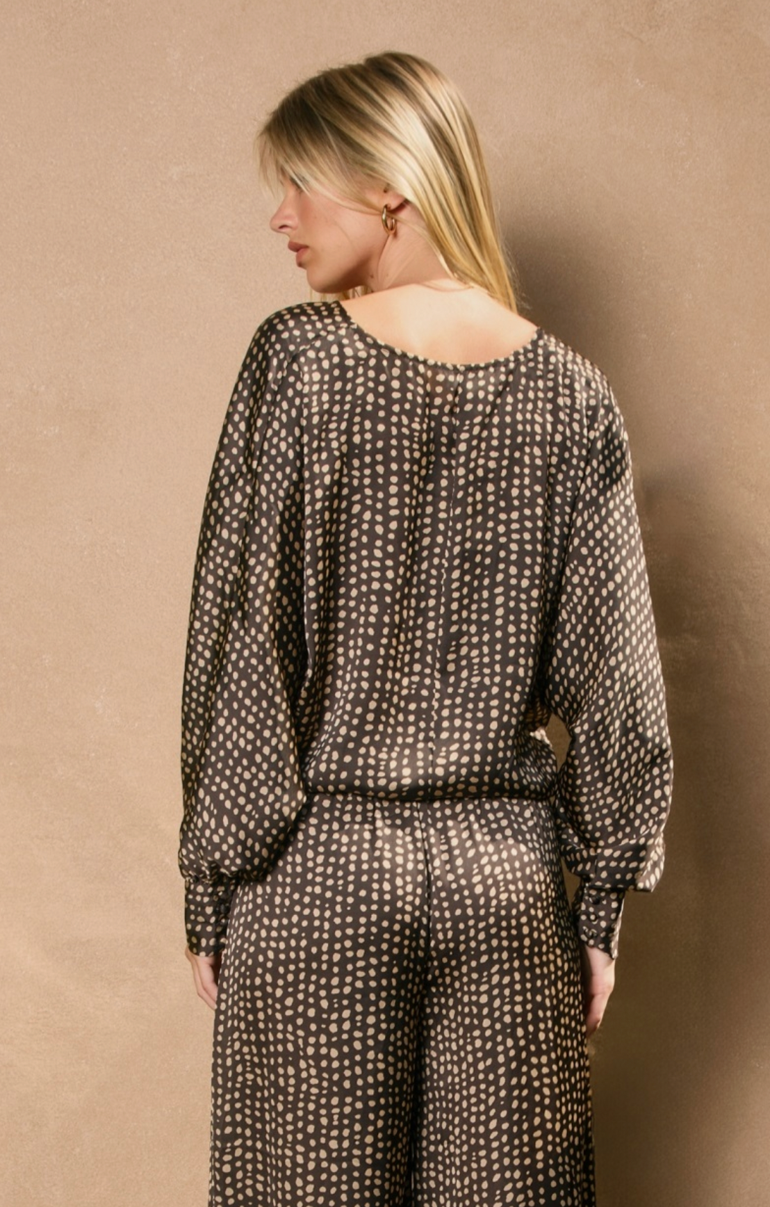The Daisy top brings effortless elegance with its charming polka dot satin print. The surplice neckline and snap button closure create a flattering silhouette, while batwing bubble sleeves with self button cuffs add contemporary flair. An adjustable tie cinches the waist for a customized fit, and the drawstring hem allows you to shape the drape. Unlined for breathable comfort, this piece transitions seamlessly from day to evening.
