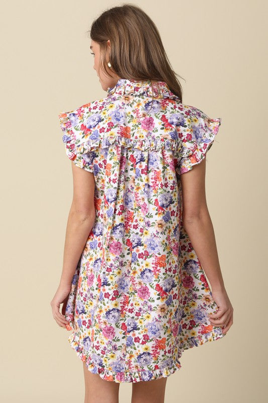 The Donna Floral Ruffle Hem Shirt Dress combines timeless elegance with effortless movement. A button-front design pairs with delicate ruffle cap sleeves for refined femininity, while the relaxed A-line silhouette and ruffled hem create a graceful, flowing drape. Perfect for layered styling or worn solo, this piece transitions seamlessly from day to evening.