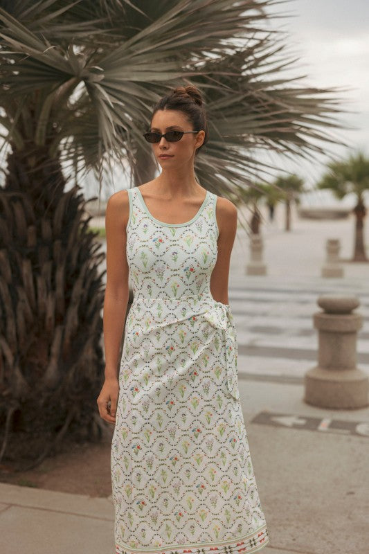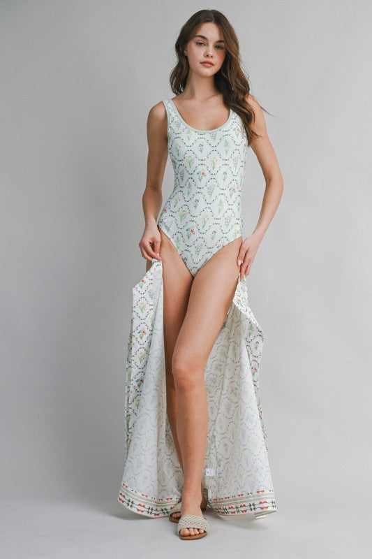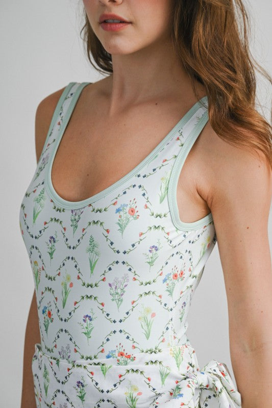 Dive into effortless elegance with The Nani set—a two-piece swim essential that balances coverage with contemporary style. The fitted one-piece swimsuit features a flattering scoop neckline and supportive shoulder straps, while the coordinating wrap skirt adds dimension with a self-tie bow at the waist and charming border print detail. Rendered in an allover floral print, this set transitions seamlessly from poolside to resort moments. Designed for those who refuse to compromise on both comfort and editorial appeal.