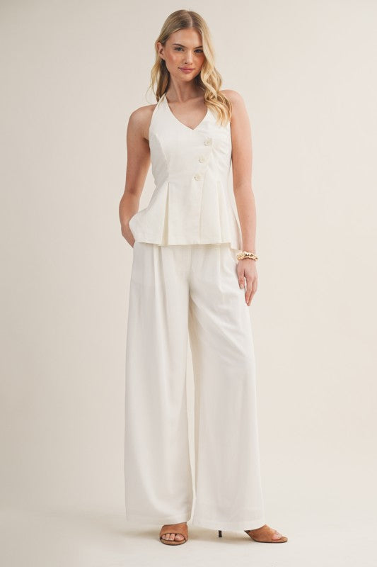 The Ava pants feature an asymmetrical waist design that creates a modern, editorial silhouette. Crafted in crisp white, these pants offer a contemporary take on tailoring with unexpected geometric lines that elevate any ensemble. The distinctive waist detail provides visual interest while maintaining a streamlined fit through the leg. Perfect for styling with minimalist tops or layered pieces, The Ava pants deliver premium sophistication with an avant-garde edge.