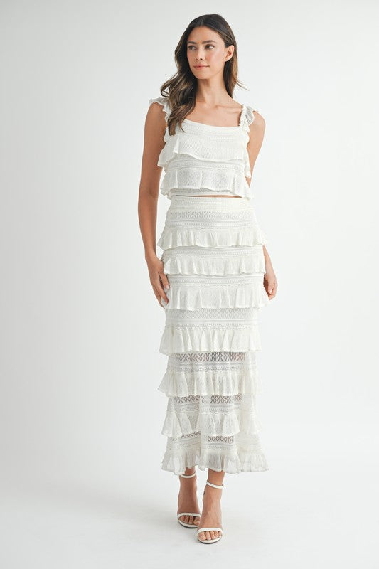 Celebrate love and style in this white two-piece ruffle set, the perfect look for a White Party, engagement party, bridal shower, or destination wedding. The square-neck crop top pairs with a tiered lace maxi skirt, featuring sheer lace panels and ruffle layers that create a romantic, elegant silhouette.