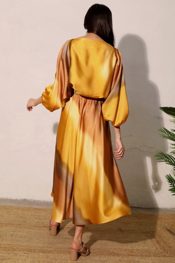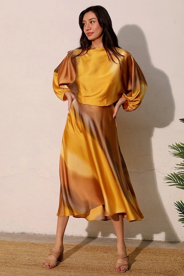 Elevate your ensemble with The Pam top, a sophisticated blouson blouse designed to command attention. The luxurious satin fabric showcases an exquisite ombre print that transitions with subtle elegance. This statement piece offers versatile styling options—create a coordinated look with the matching skirt or contrast beautifully against light washed denim for effortless refinement.
